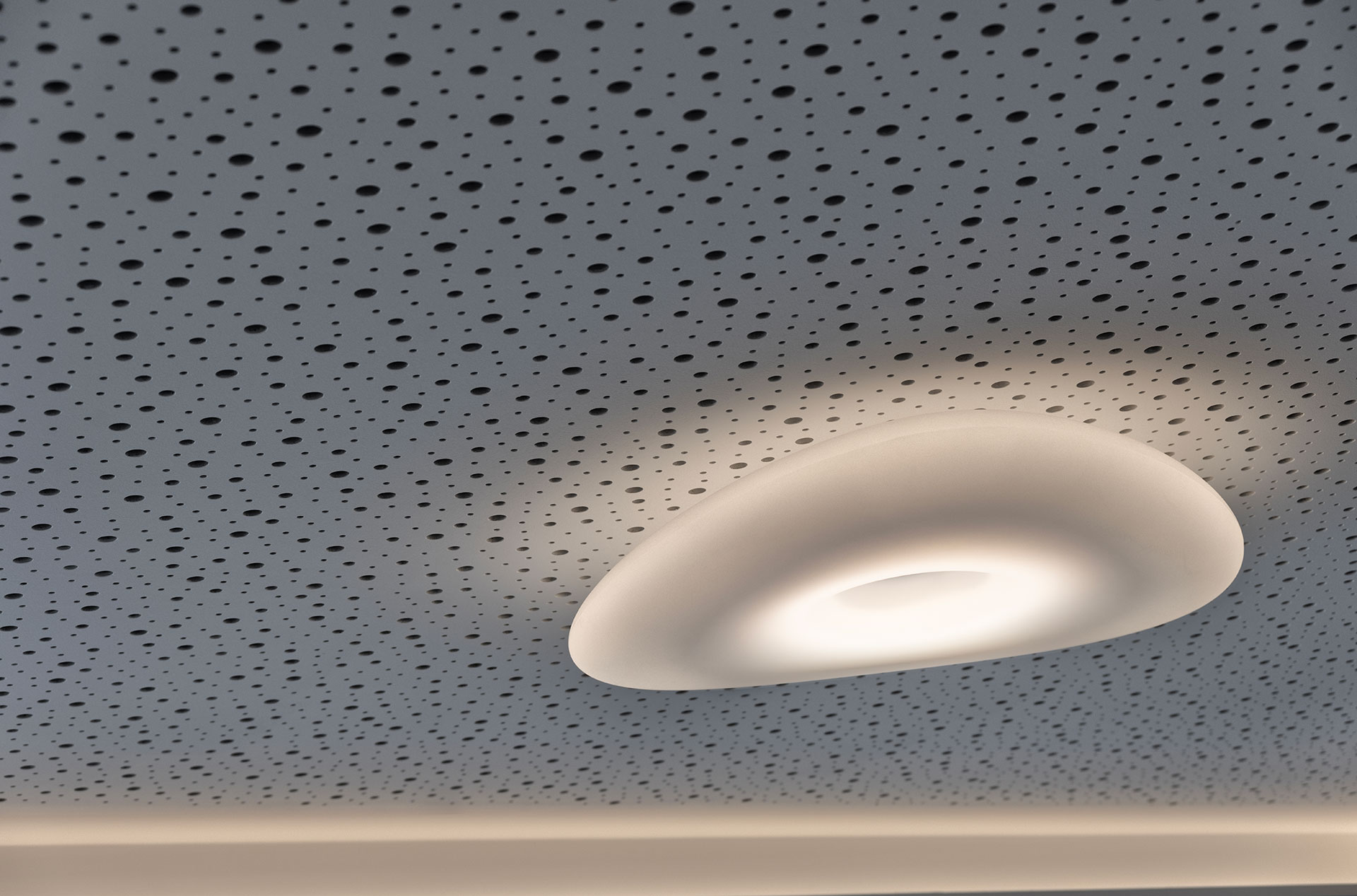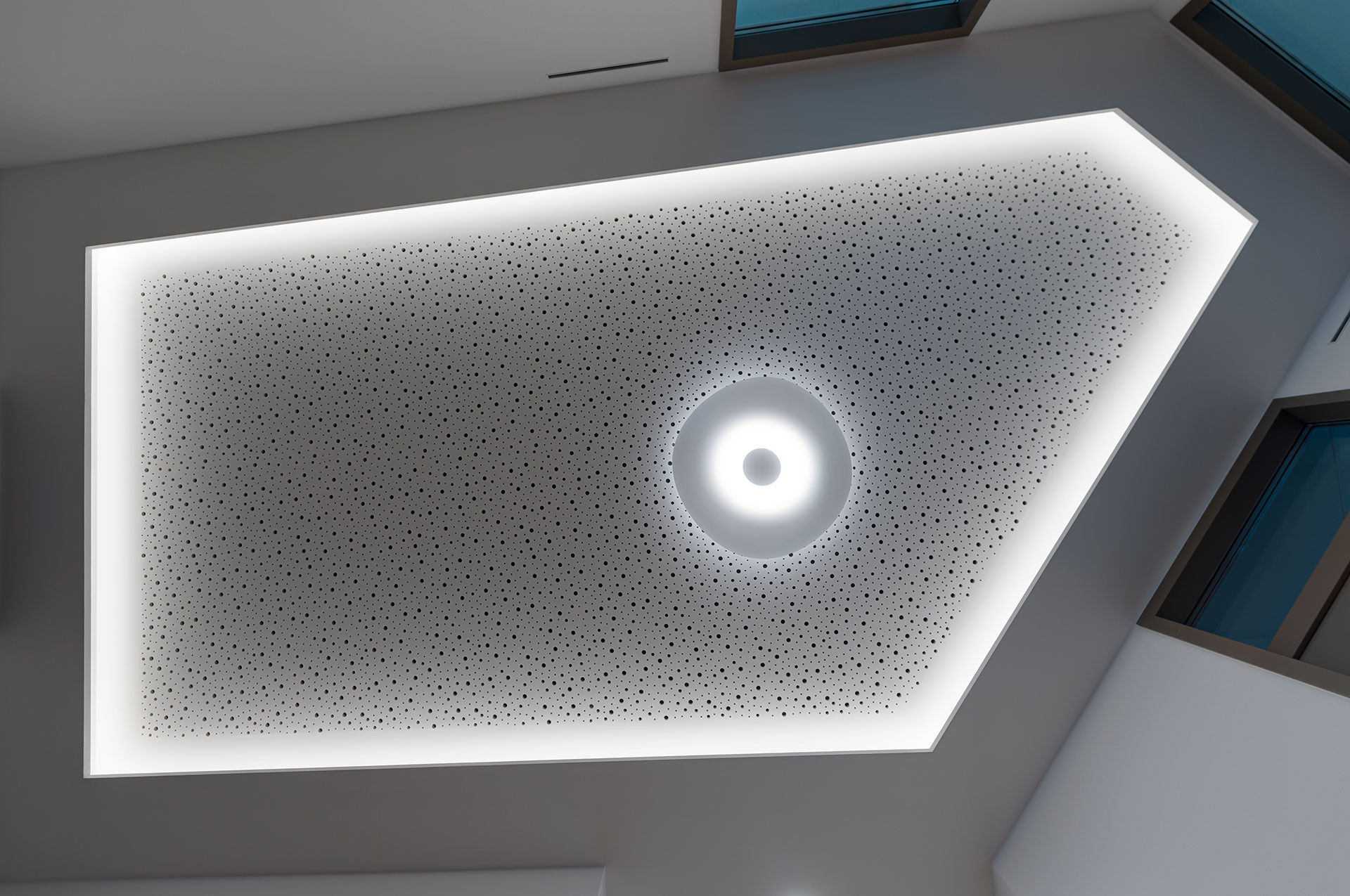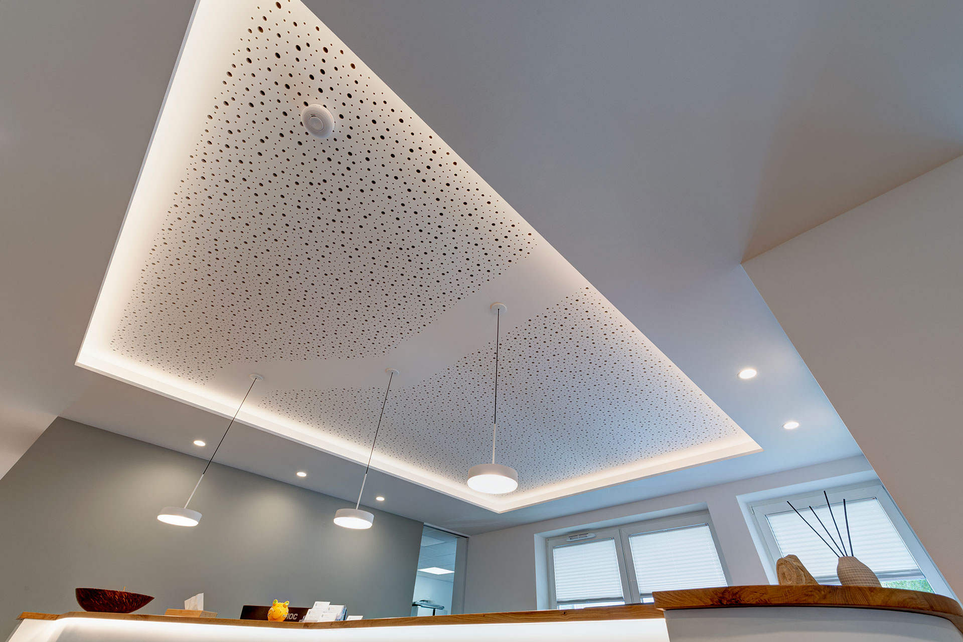 « Zurück zur Übersicht NEUE KIRCHE. BESTE RAUMAKUSTIK. Projektdetails Projekt: Neubau Kirche Bauherr: Kirchengemeinde St. Nathanael Architektur: ksw architekten+stadtplaner, Hannover Fertigstellung: Dezember 2019 Trockenbau: Germerott Innenausbau GmbH & Co. KG Fotos: Ralf Mohr, Hannover Leistungen/Herausforderungen Im Stadtbezirk Bothfeld im Norden Hannovers ist ein neues Zentrum für die evangelisch-lutherische Kirchengemeinde St. Nathanael entstanden. Seit der Gründung der Gemeinde in den Sechzigerjahren gab es bereits Pläne für einen Kirchen-Neubau. Aus verschiedenen Gründen verzögerte sich jedoch die Realisierung, und der ursprünglich provisorische Kirchensaal im Gemeindezentrum wurde zur Dauerlösung. Erst die Auslobung eines Architekturwettbewerbs erweckte das Projekt wieder zum Leben. Seit Ende 2017 wird nun auf dem Gelände saniert, gebaut und demnächst auch abgerissen – für ein ganz neues Quartier. Neben der Sanierung des Glockenturms und dem Bau der Kirche werden hier in den nächsten Jahren auch Reihenhäuser auf der Fläche des derzeitigen Gemeindezentrums entstehen. Der von ksw Architekten+Stadtplaner entworfene Neubau ist daher hochfunktional geplant und vereint zukünftig einen Kirchen- und Gemeindesaal sowie ein großes Foyer mit zwei Gruppenräumen. Alle Räume können bei Bedarf geöffnet und zu einem zusammenhängenden Saal verbunden werden. Den Innenausbau im neuen Gebäude übernahm das erfahrene Team von Germerott, zu dessen Aufgaben der Einbau einer Akustik-Lochdecke aus Gipskarton im Verwaltungsbereich sowie der Einbau von Leichtwänden im Erdgeschoss gehörten. Besonderes Highlight ist die im 140 Quadratmeter großen Kirchensaal eingebaute Akustikdecke. Um hier ein optimales Klangziel zu erreichen, wurde in Zusammenarbeit mit einem Akustiker eine ca. 20 Quadratmeter große Musterdecke im Maßstab 1:1 hergestellt, die nicht nur bei der Planung und Konzeption, sondern auch für die spätere Montage sehr hilfreich war. Alle notwendigen Deckenelemente stellte das hauseigene Kompetenzzentrum für Formteilebau bereit, sodass vor Ort ein schnellerer Arbeitsprozess möglich war. Die Gesamtdeckenkonstruktion mit ihren mehrfach abgestuften, glatten Deckenfeldern, welche jeweils über eine integrierte, einseitige und steuerbare Lichtroute verfügen, sorgen durch ihre RGB-Steuerung für die unterschiedlichsten Stimmungsbilder. Microperforierte Platten (Akustiklochplatten) bilden den seitlichen Abschluss der Deckenkonstruktion. Diese Konstruktionsweise findet sich auch im Bereich des Altars wieder. Das lange Warten auf einen neuen Kirchensaal hat sich gelohnt. Der moderne Kirchenbau beeindruckt durch seine räumliche Flexibilität und bietet seinen Besuchern ein einmaliges akustisches Erlebnis. Artikel als PDF herunterladen