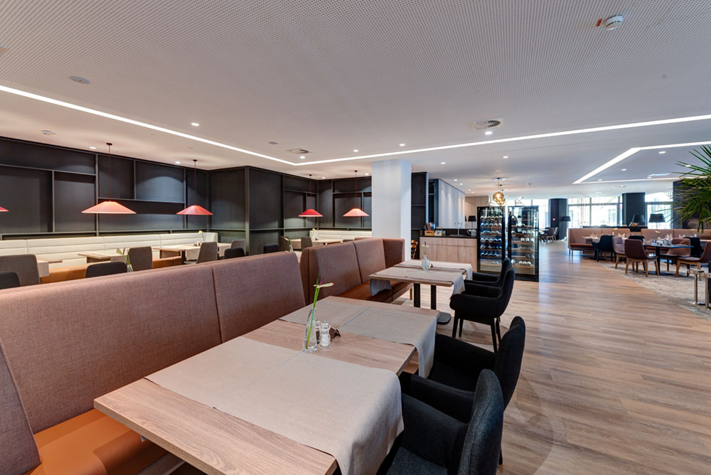 « Zurück zur Übersicht TRENDGERECHTE MODERNISIERUNG HOTEL SCHWEIZERHOF Projektdetails Projekt: Neugestaltung Rezeption, Lobby und Restaurant des Hotels DoubleTree by Hilton Hannover Schweizerhof Bauherr: Schweizerhof Hotel GmbH & Co. KG Architektur: MAY Architectural Design Architekten Partnerschaft mbB, Rolf May, Köln Fertigstellung: September 2022 Trockenbau: Germerott Innenausbau GmbH & Co. KG Fotos: Ralf Mohr Photographie Leistungen/Herausforderungen Mit seiner Lage in unmittelbarer Nähe der Königsstraße und der kurzen Distanz zur Staatsoper gehört das Hotel Schweizerhof in Hannover zu den gefragtesten Adressen der Stadt. Das Vier-Sterne-Superior-Haus gilt insbesondere bei Geschäftsreisenden als bevorzugter Aufenthaltsort und eignet sich vornehmlich für Tagungen und Konferenzen. Im Zuge des erfolgten Markenwechsels zu DoubleTree by Hilton hat der Eigentümer an der Hinüberstraße 6 auch gestalterisch eine neue Ära betreten. Nach der Planung von MAY Architectural Design und Generalunternehmer VCE – Vöcker Concept Einrichtungen strukturierte Germerott Innenausbau die Flächen des Restaurants, Konferenzraums und der Rezeption um. Ebenso ergänzten sie neben der Rezeption ein großes Kaminzimmer und repräsentative Aufenthaltsbereiche. Die entsprechende Deckenfläche von 1.000 Quadratmeter wurde individuell gestaltet. Auch die Sanitärbereiche präsentieren sich in einem neuen modernen Design. Alle Arbeiten führten die Innenausbauer aus Gehrden im laufenden Betrieb aus und schufen innerhalb kürzester Zeit ein neues Ambiente für den Schweizerhof. Im Vorfeld der Trockenbauarbeiten musste der Bestand in den betreffenden Bereichen entkernt werden. Hierfür wurden sowohl die Wände als auch der Fußbodenbelag und der Estrich entfernt. Im Anschluss bildete das Team die Räumlichkeiten neu und zog die Trockenbauwände ein. Die erforderlichen Maßnahmen für die Barrierefreiheit und den Brandschutz gingen dabei einher. Der WC-Bereich erhielt glatte Gipskartondecken und neue Türelemente. Im Restaurant, Kaminzimmer, Konferenzbereich und in der Rezeption setzten die Innenausbauer umlaufende Lichtvouten, Frise und Lichtgräben ein, die die unterschiedlichen Deckenformen aus quadratischen und rechteckigen Feldern umrahmen. Insgesamt 300 Meter dieser im Kompetenzzentrum für Formteilebau vorgefertigten und auf der Baustelle montierten Elemente verlaufen parallel zur Fensterfront. Sie rahmen achtzehn verschieden große in Glattfriese eingebettete Lochgipsfelder ein, die die Bereiche nicht nur optisch gestalten, sondern auch akustisch optimieren. Darüber hinaus dämpfen sie den Gesprächspegel im Restaurant, und sorgen dafür, dass sich die Schallwellen nicht ausbreiten und in allen neu gestalteten Bereichen eine angenehme Atmosphäre geschaffen wird. Das neue Beleuchtungskonzept wurde perfekt auf die Akustikdecken abgestimmt. Die Deckenflächen wurden im Anschlussbereich umlaufend mit einem schwarz hinterlegten Metallprofil ausgebildet. Im gesamten Umbaubereich arbeiteten sie außerdem überwälzte Türelemente mit umlaufend eingelassenen Schattennuten aus, die sich nun als gestaltendes Element optisch ins Gesamtbild einfügen. Einem weiteren Highlight begegnen die Gäste gleich am Empfang: Rund 2,50 Meter lange und 30 Zentimeter breite Lichtgräben strukturieren die Decke oberhalb der Rezeption und stellen sicher, dass der Bereich sowohl blendfrei als auch hell erleuchtet ist. Zugeschnitten und montiert wurde diese Konstruktion in zwei Bauabschnitten komplett vor Ort. Während ein Bauabschnitt fertiggestellt war, setzte sich daneben der normale Rezeptionsalltag fort. Zwischen dem Restaurant und dem Buffet formt eine aus Deckenschürzen und -feldern zusammengesetzte Stufenkonstruktion einen weiteren gestalterischen Akzent. An dieser Stelle grenzt der 3,54 Meter hohe Saal an die rund ein Meter niedrigere Verkehrszone/Arbeitsgang an. Die abgehängte Decke überwindet die Distanz in drei ca. 30 Zentimeter breiten Stufen und bildet dabei eine umgedrehte Treppenkonstruktion aus. Eine Verspachtelung sämtlicher Wand- und Deckenflächen in der Qualitätsstufe 3 rundete die Oberflächengestaltung im gesamten Bereich ab. So bilden die gestrichenen bzw. tapezierten Flächen einen optisch und akustisch optimalen Rahmen für die umgestalteten Räume im neuen DoubleTree by Hilton Hannover Schweizerhof und die ideale Basis für das neue Design. Artikel als PDF herunterladen